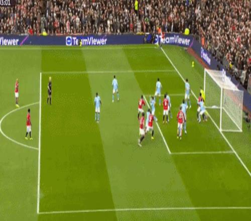 第4分钟,曼联球员多尔古左路低平球传中,胡桑诺夫关键解围,随后B费开出角球,马奎尔近距离头球攻门击中横梁弹出,曼城逃过一劫。