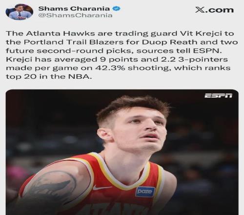 爆料王Shams:老鹰将克雷伊奇送至开拓者,换回里斯+两个次轮签。